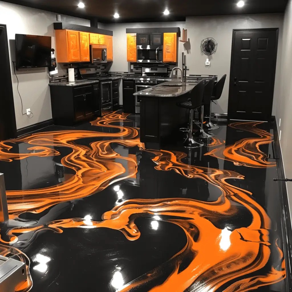 Fascinating finishes such as cloudy, wavy, or lava-like are created using different brushing techniques, solvents, and blowers. Visuals such as lava, slow-burning embers, clouds, and even waves are examples of these finishes. Nothing looks more beautiful than a metallic epoxy garage floor.